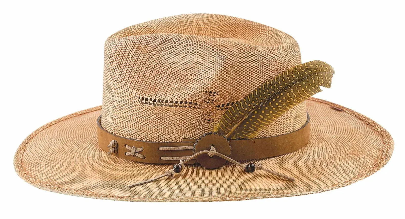 Why not show off your wild side with the Chasing Summer, from the Western Couture Collection by Bullhide. This vibrant hat features Bangora straw material, a vented pinchfront crown, and a 3 1/2" brim. The hatband is a unique leather;like material with a playful concho and beautiful feather. Feathers may vary in color and/or size