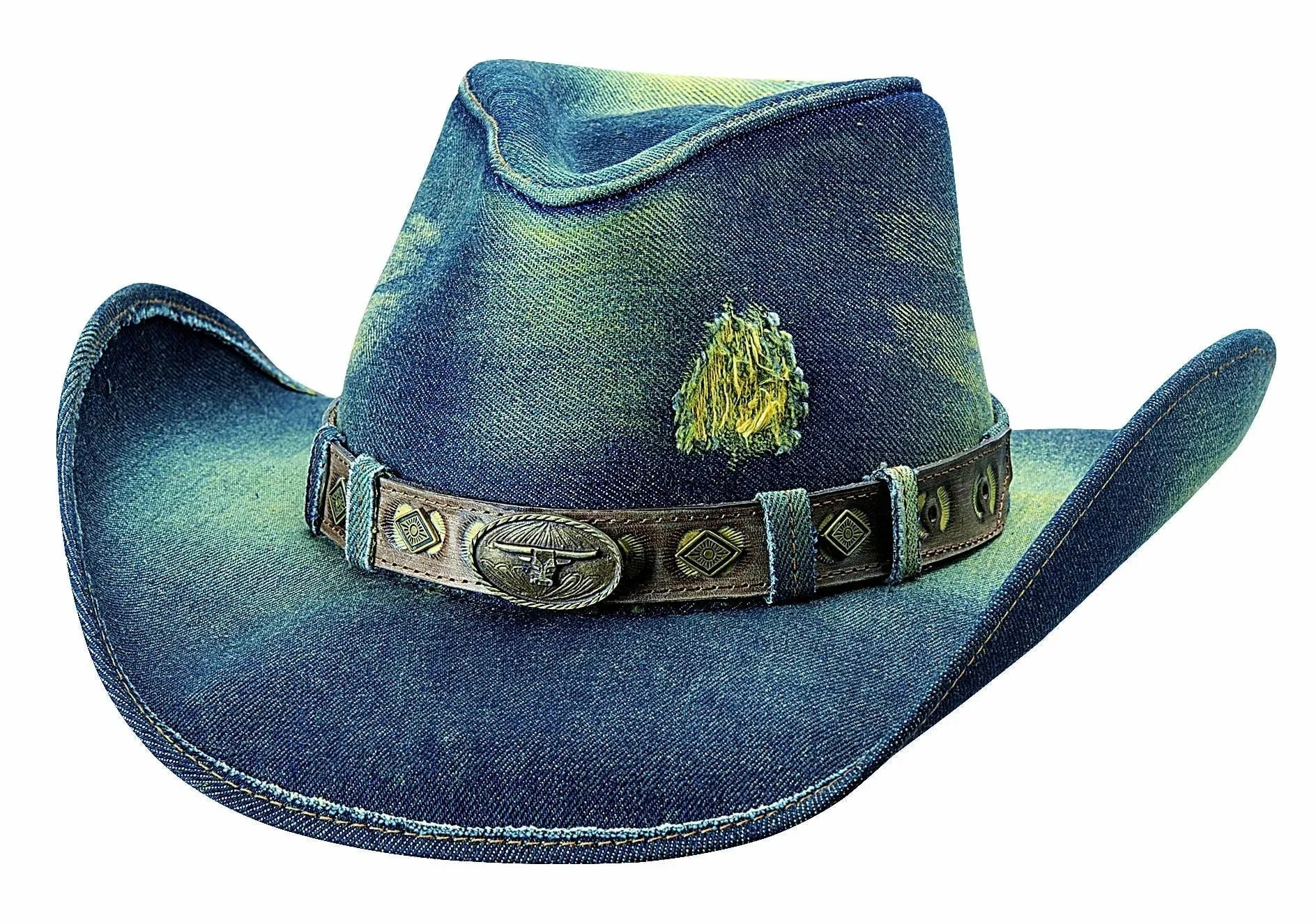 Perfect for any outfit the Nonstop features Denim material, a pinch front crown, and a leather hatband with a bullhead Concho centered in the front.