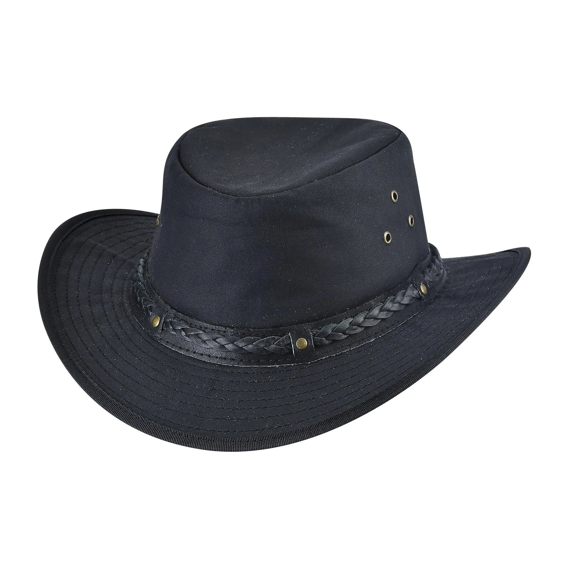 Take a ride on the wild side with the Pinnacle from the Down Under Collection by Bullhide. This hat features waterproof weathered cotton oilskin material, a 2 1/2" brim, and a Australian crown with eyelets. The hatband is braided leather;like material to bring the whole look together.