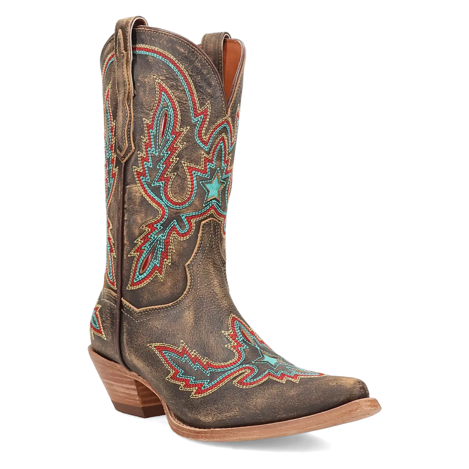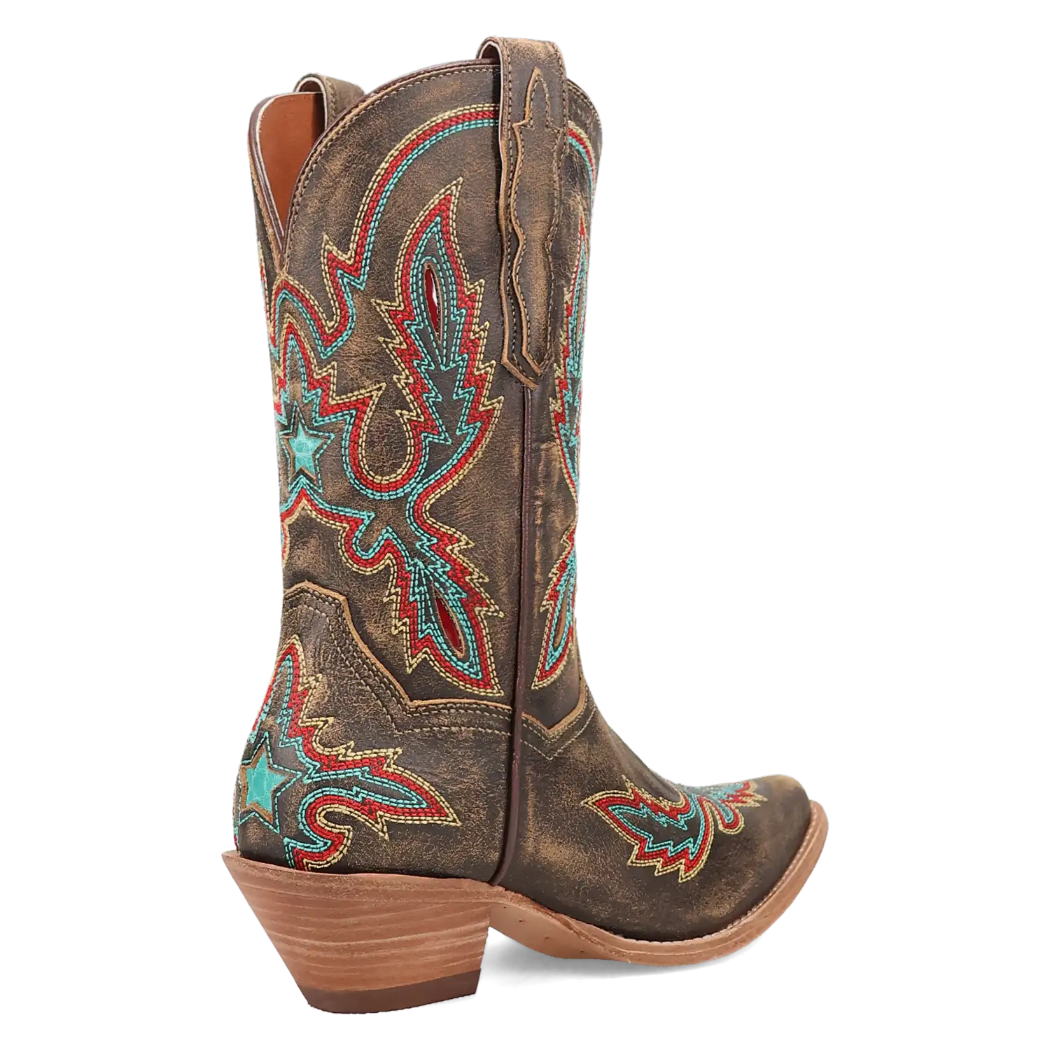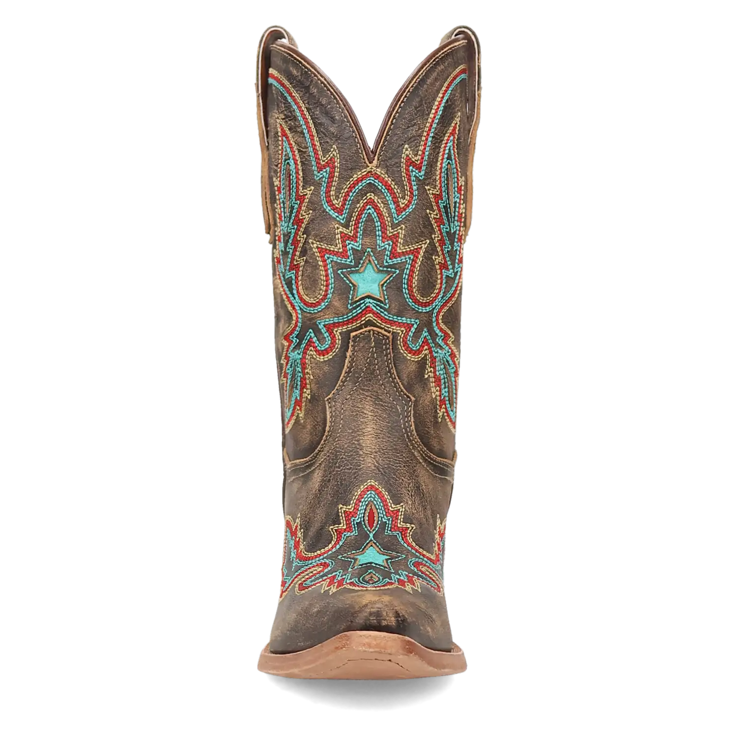 What truly sets the Starbright apart is its bold, colorful design. The tan leather is the perfect canvas for vibrant western embroidery in hues of blue, red, and yellow, which pop beautifully against the neutral background. Star emblems placed at the front and back of the shaft—and echoed across the vamp—add a fun, eye-catching detail that brings the whole boot to life.