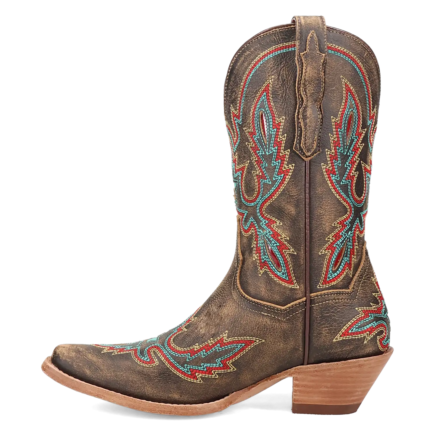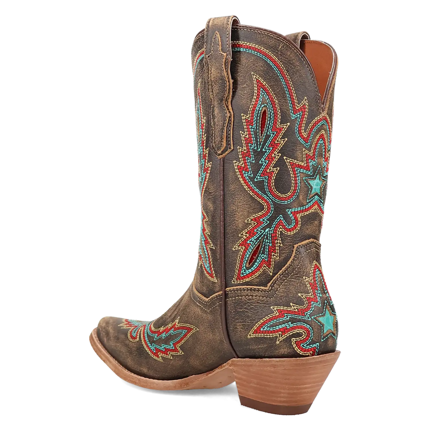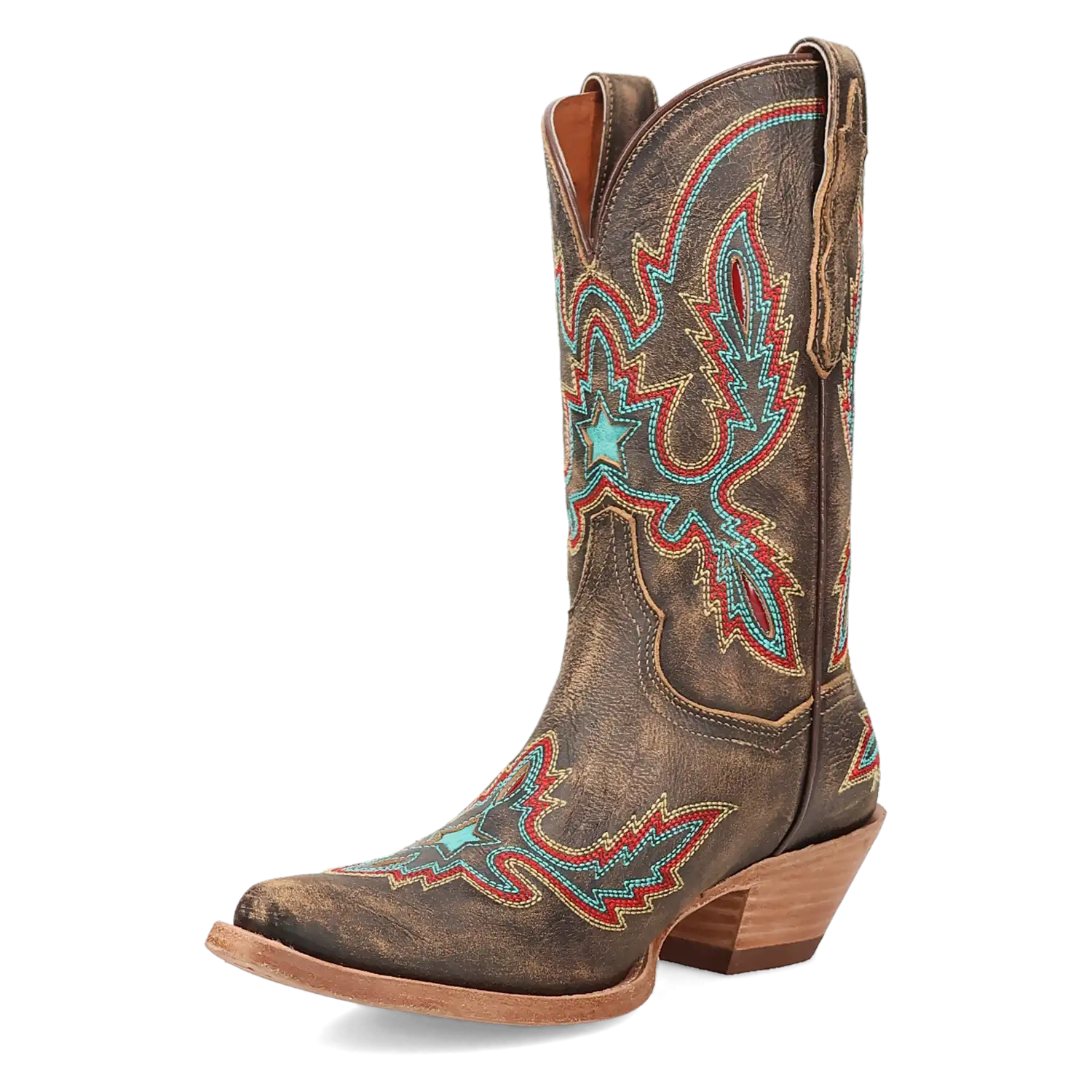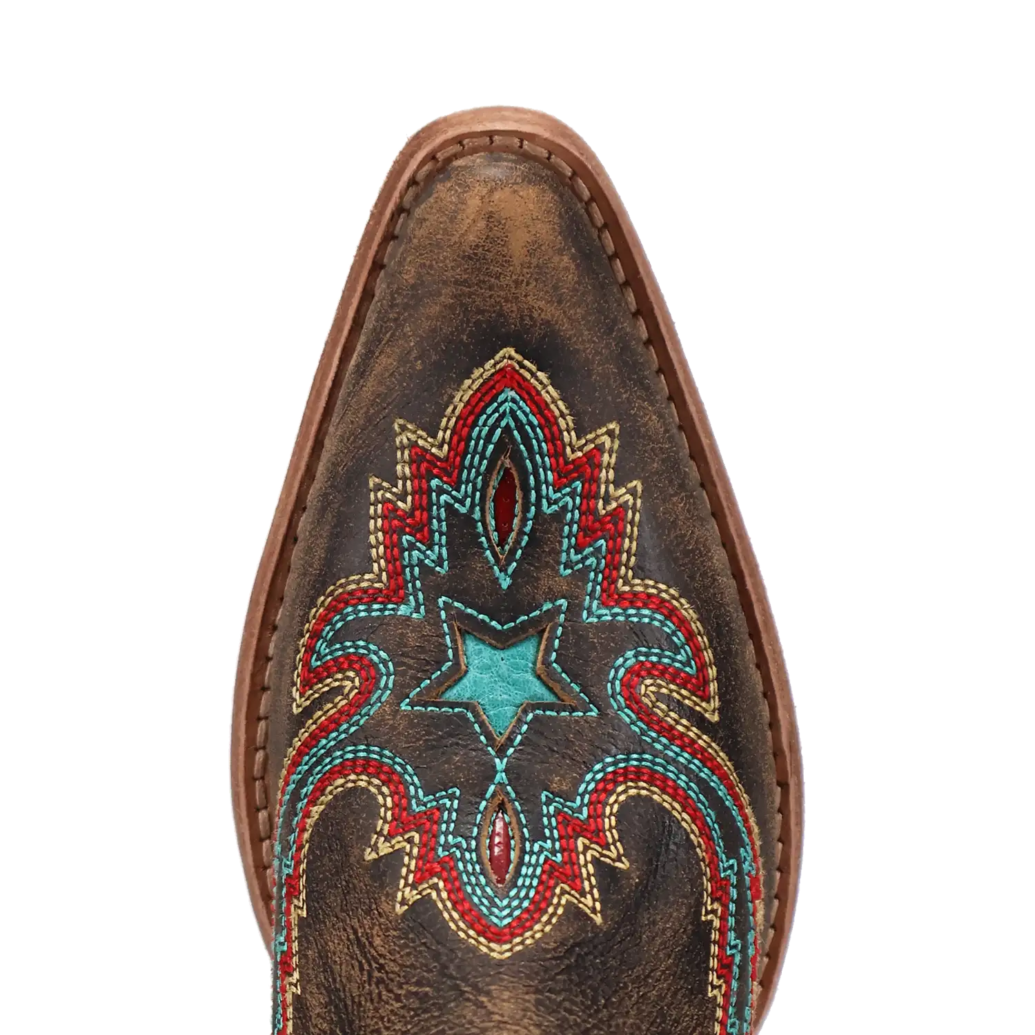 What truly sets the Starbright apart is its bold, colorful design. The tan leather is the perfect canvas for vibrant western embroidery in hues of blue, red, and yellow, which pop beautifully against the neutral background. Star emblems placed at the front and back of the shaft—and echoed across the vamp—add a fun, eye-catching detail that brings the whole boot to life.