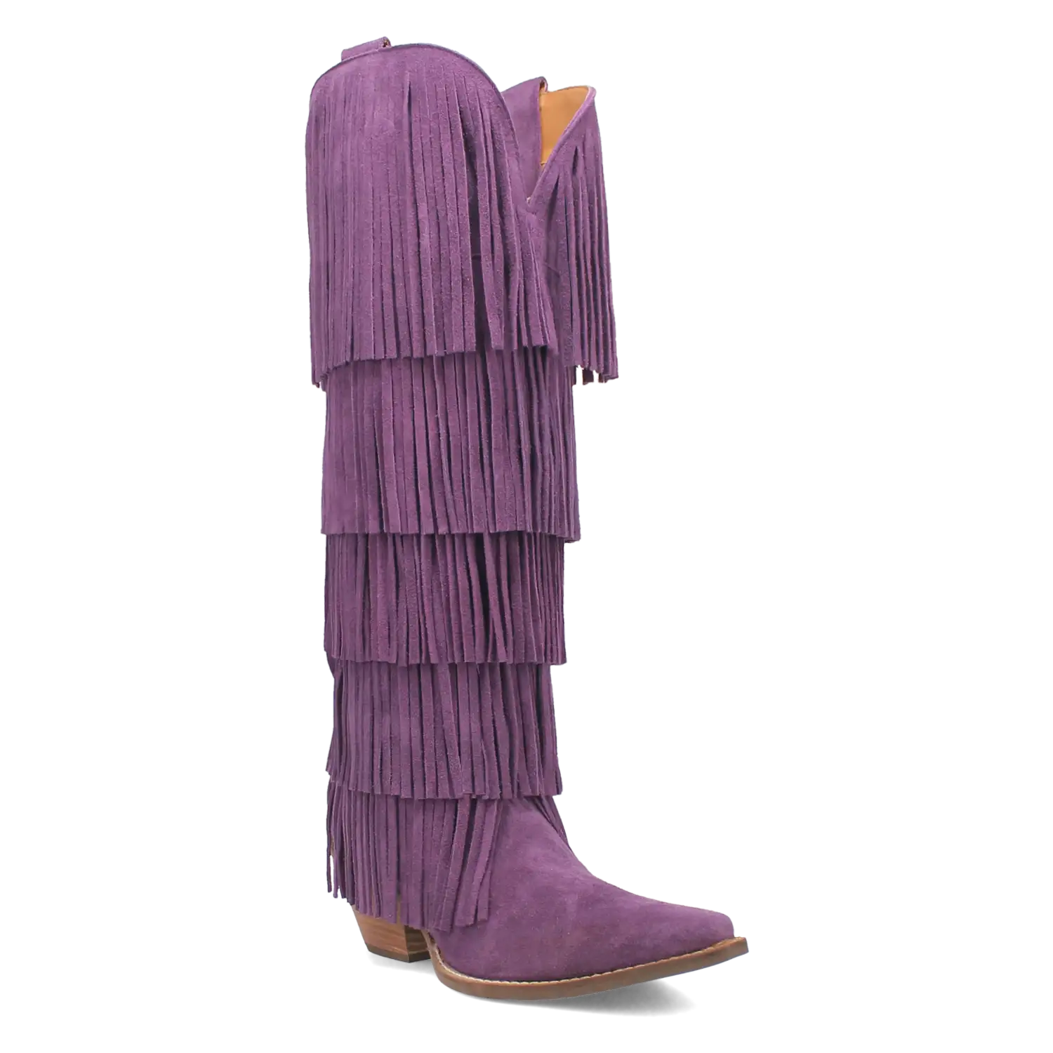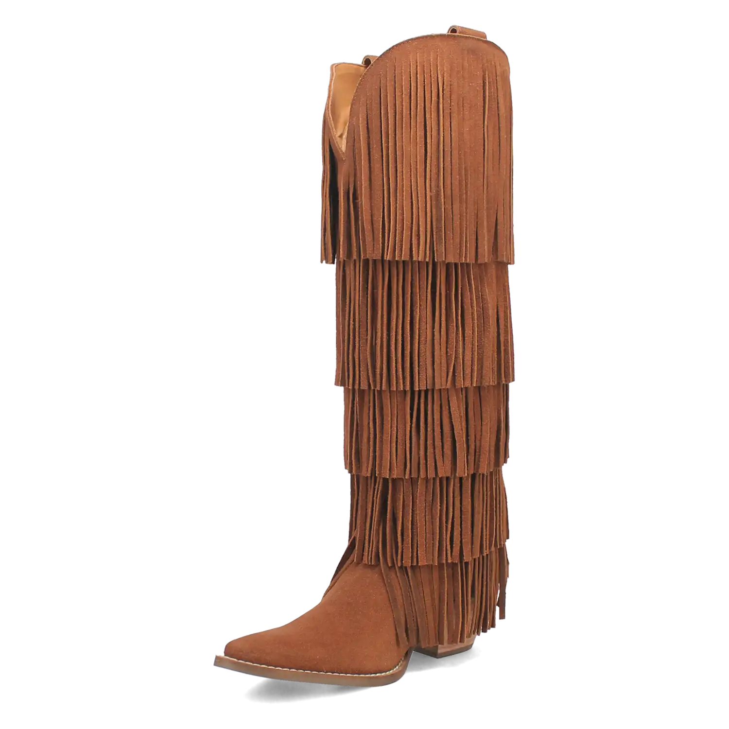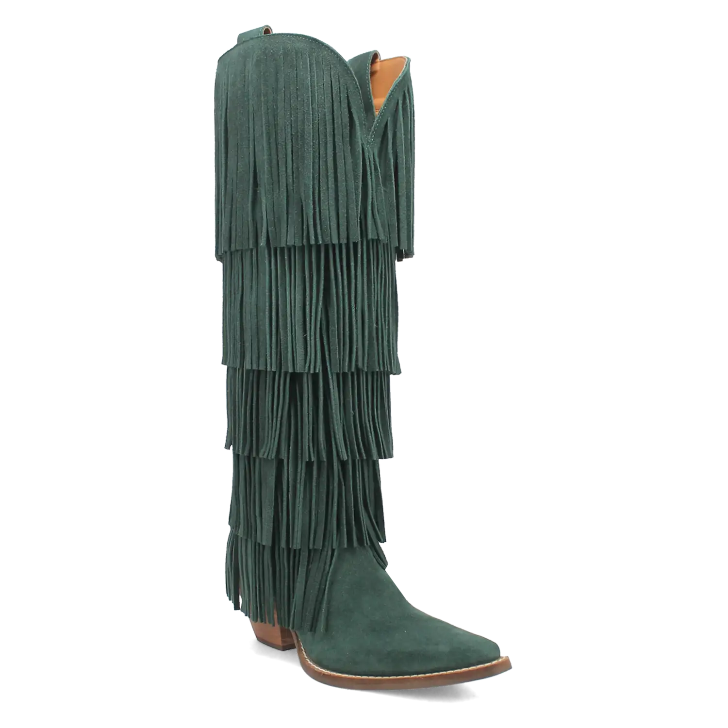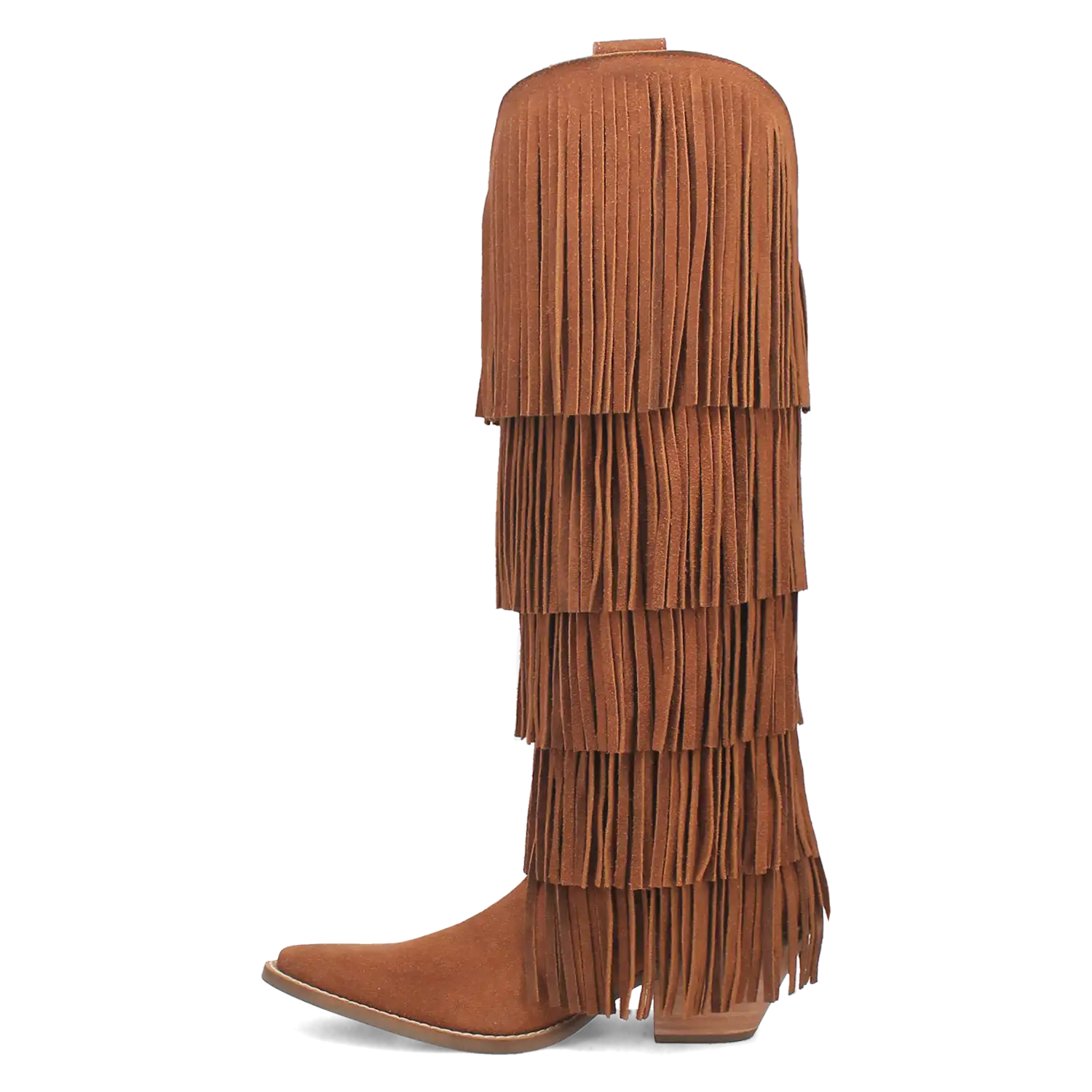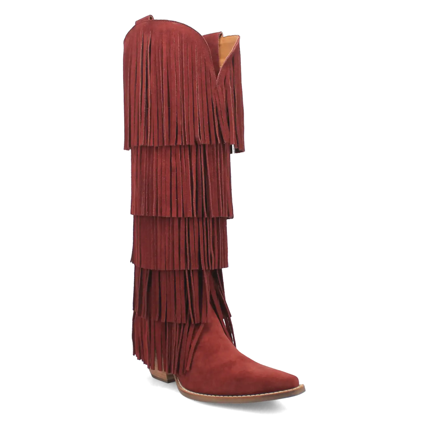 Let Your Wild Side Shine with the Dingo Wild Child boots! Crafted from sumptuous suede leather, these boots feature cascading tiers of fringe that create eye-catching movement with every step. Whether you're walking into a room or dancing the night away, these boots will have you turning heads. Available in various colors, you can find the perfect shade to match your bold and free-spirited vibe.