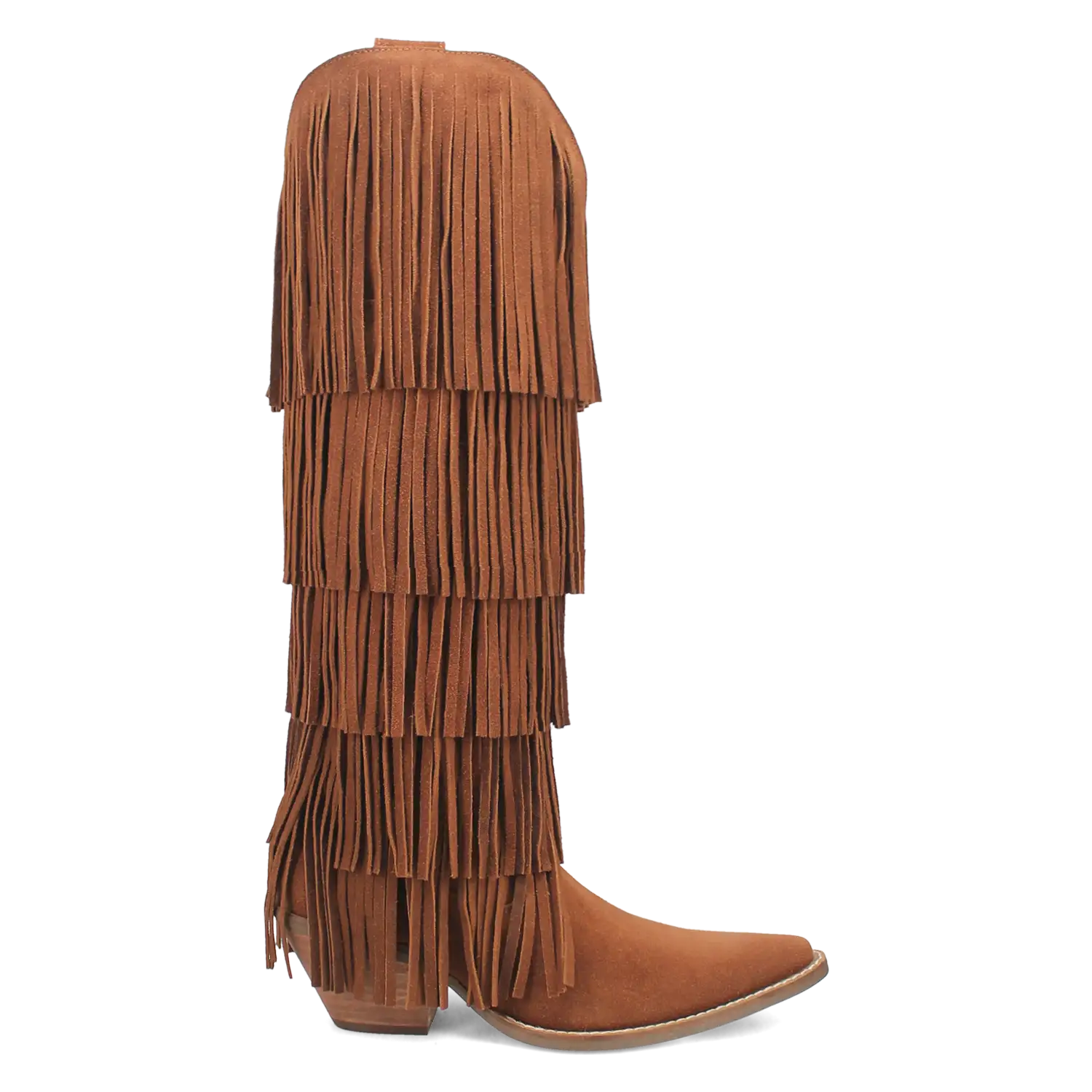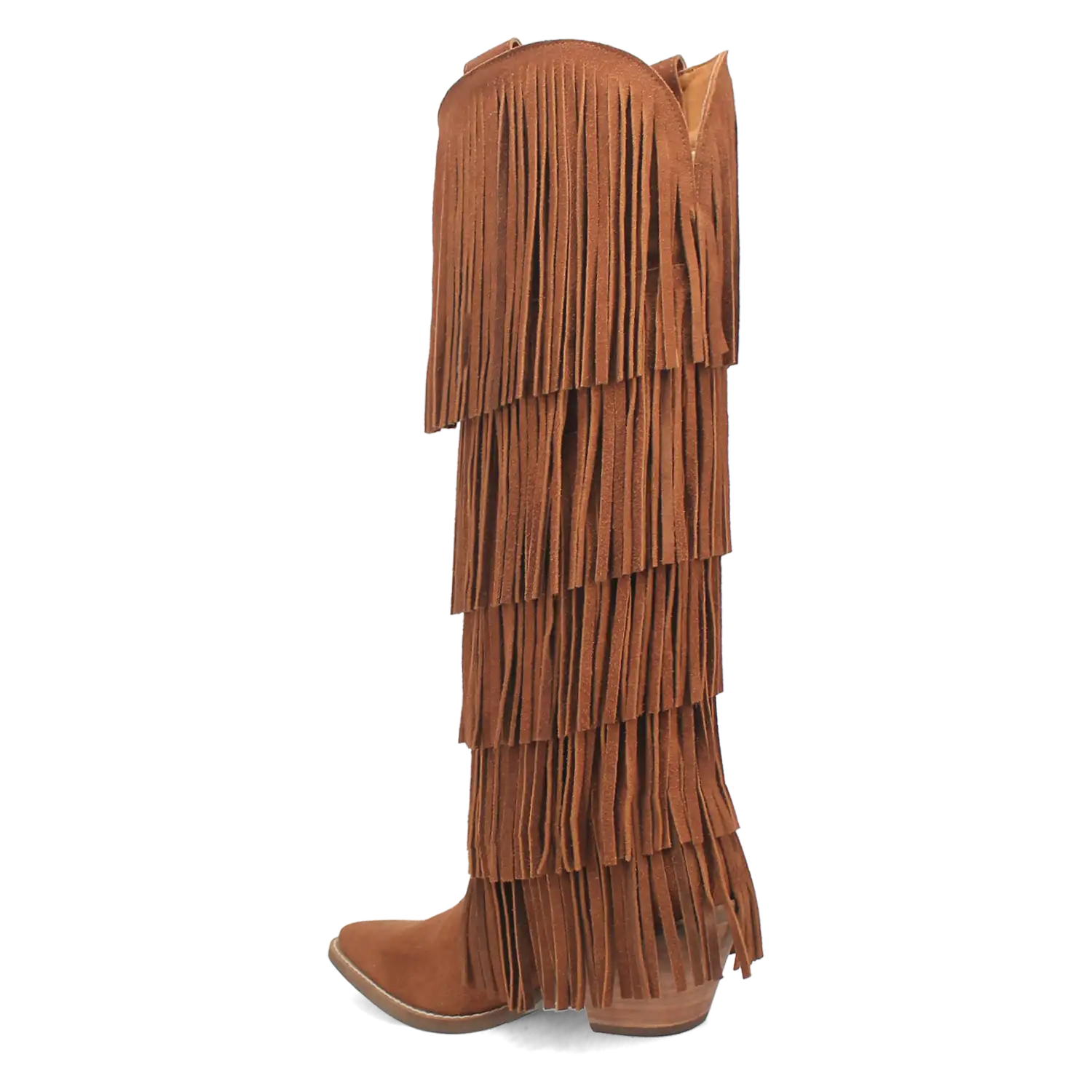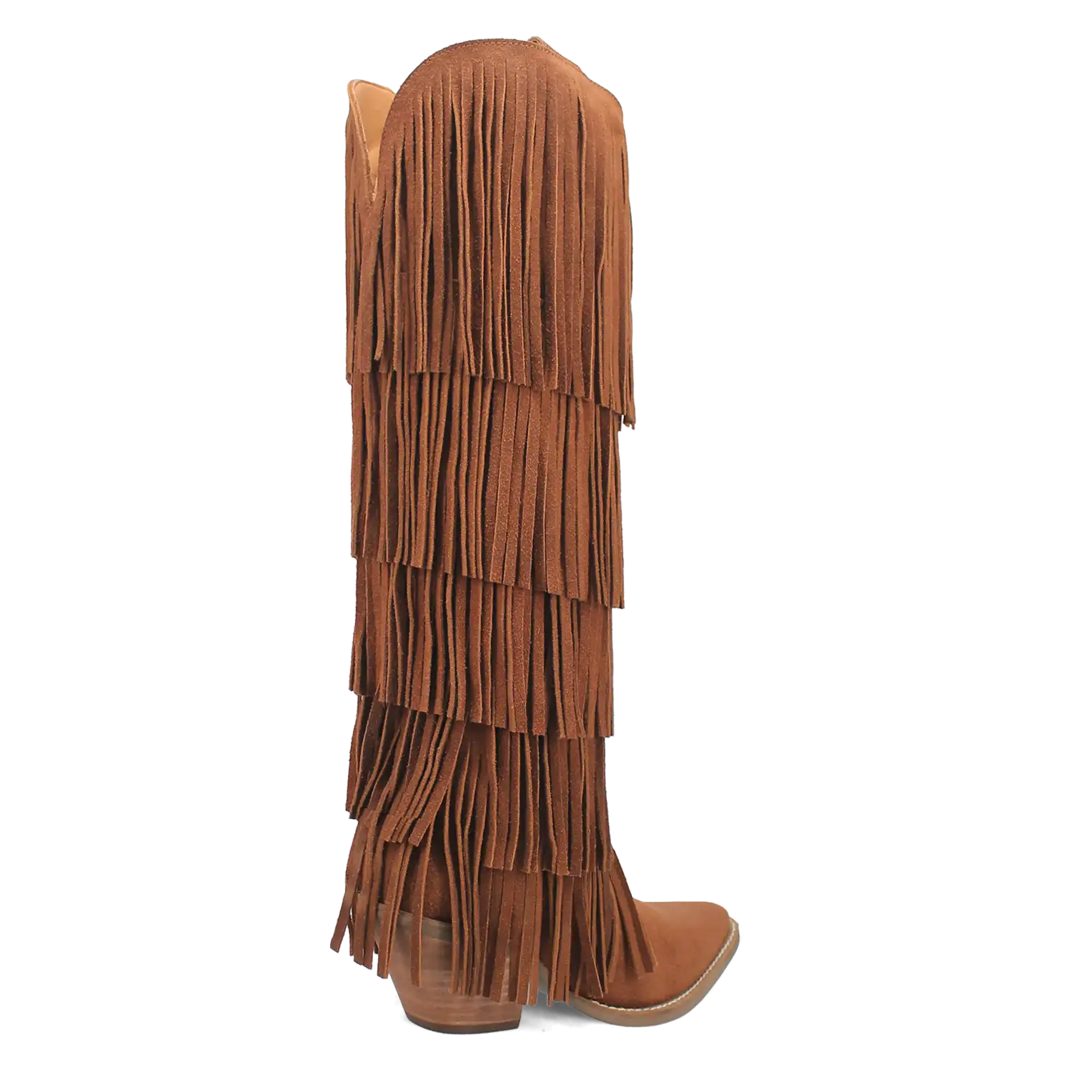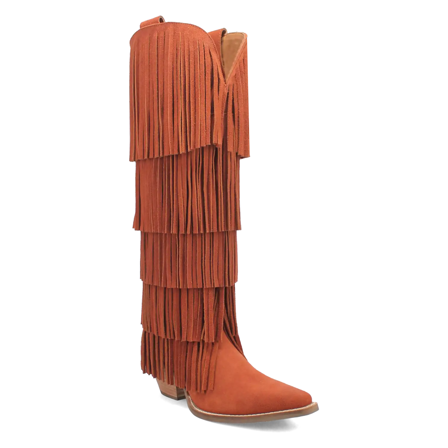 Let Your Wild Side Shine with the Dingo Wild Child boots! Crafted from sumptuous suede leather, these boots feature cascading tiers of fringe that create eye-catching movement with every step. Whether you're walking into a room or dancing the night away, these boots will have you turning heads. Available in various colors, you can find the perfect shade to match your bold and free-spirited vibe.