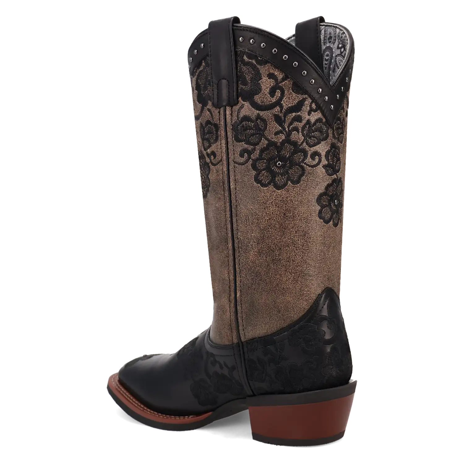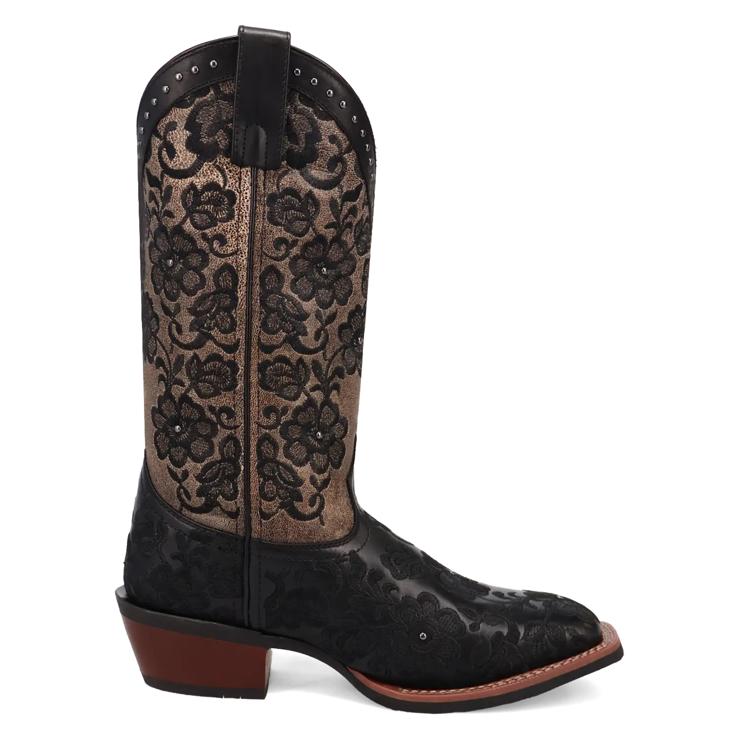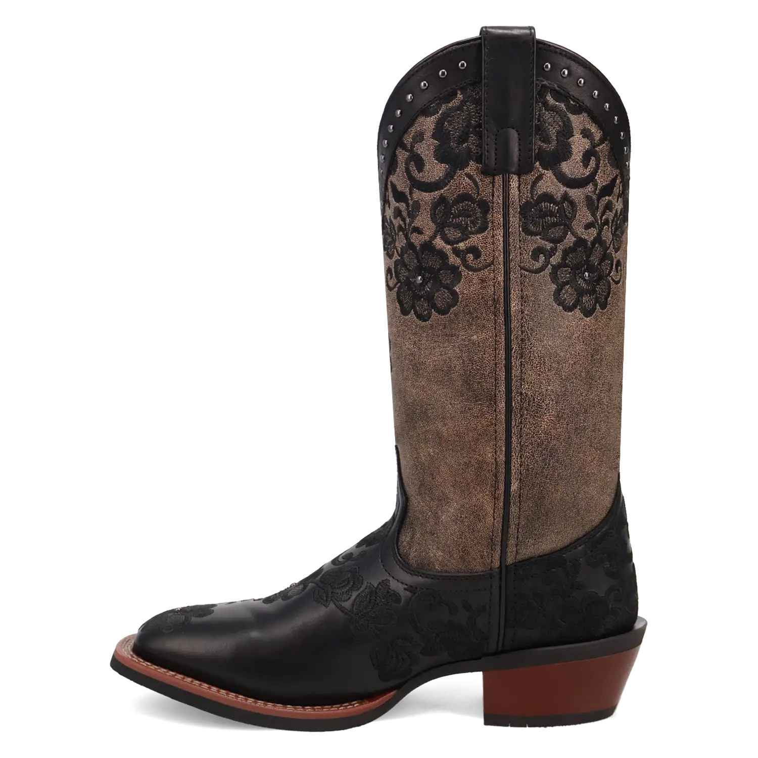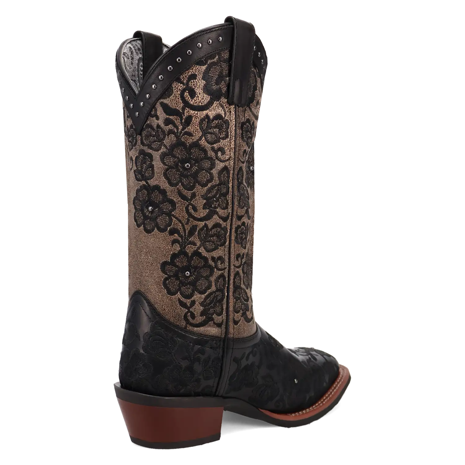 Just like its name, the Laredo Flora Cowgirl Boot brings beauty and grace to any occasion. Crafted from genuine leather, this boot features stunning black floral embroidery along the brown shaft, adding a touch of intricate elegance. The rim of the boot is beautifully adorned with studded detailing, providing a perfect balance of femininity and edge.