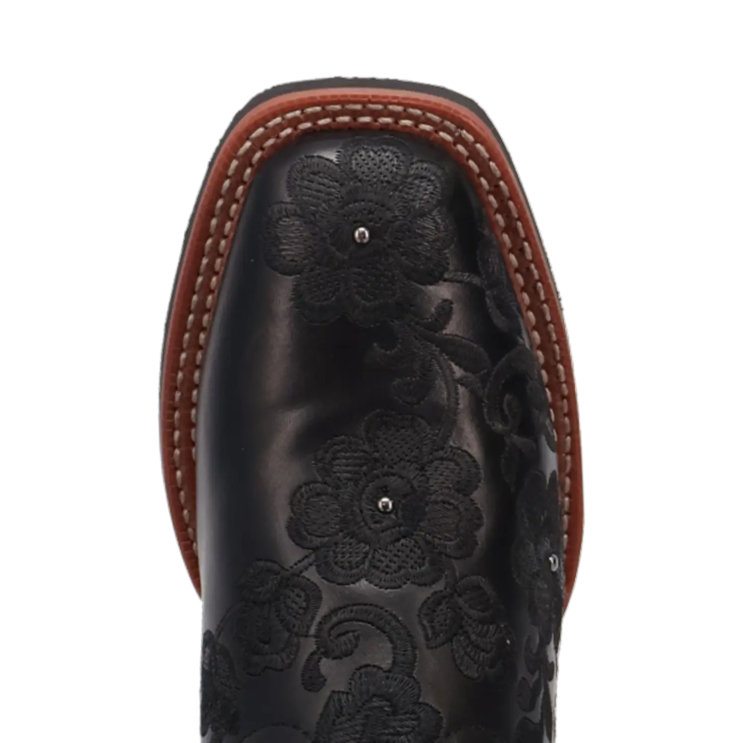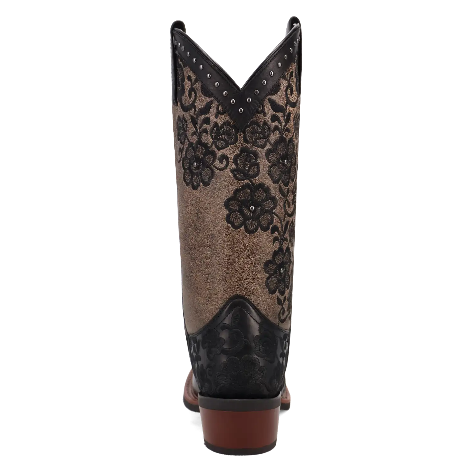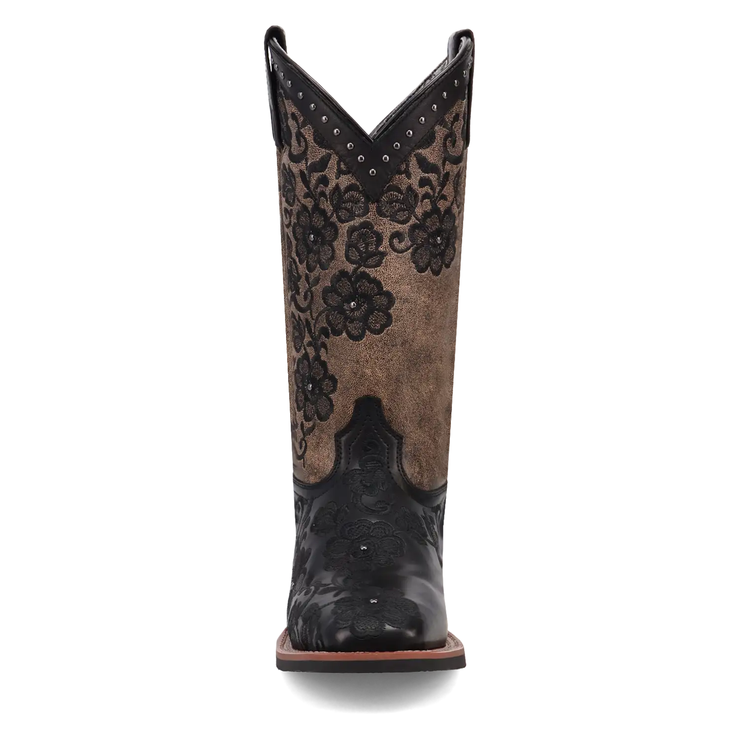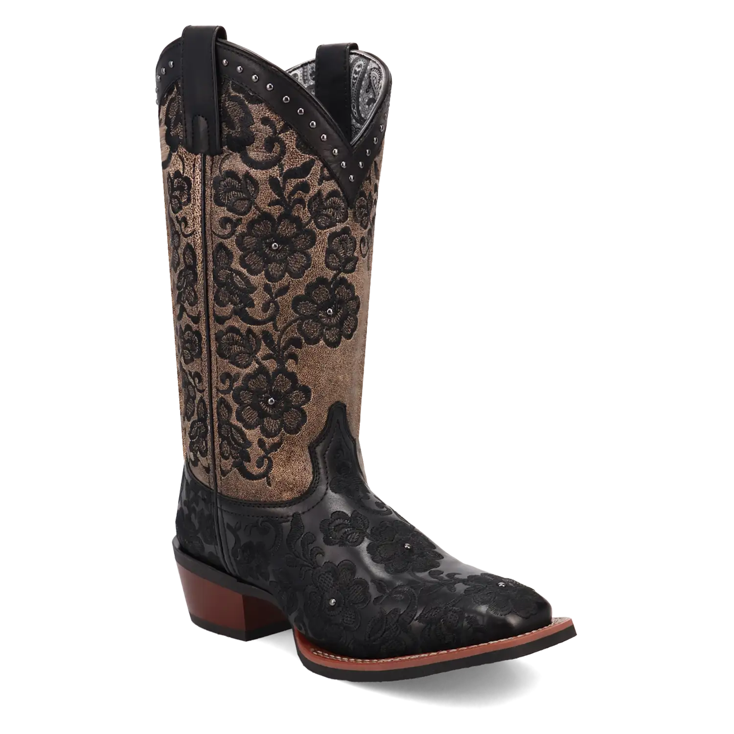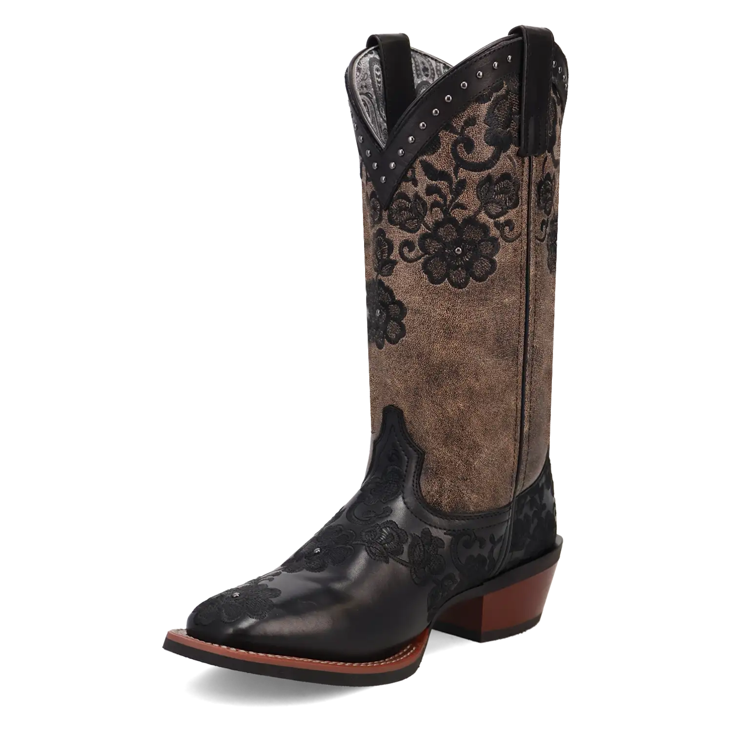 Just like its name, the Laredo Flora Cowgirl Boot brings beauty and grace to any occasion. Crafted from genuine leather, this boot features stunning black floral embroidery along the brown shaft, adding a touch of intricate elegance. The rim of the boot is beautifully adorned with studded detailing, providing a perfect balance of femininity and edge.