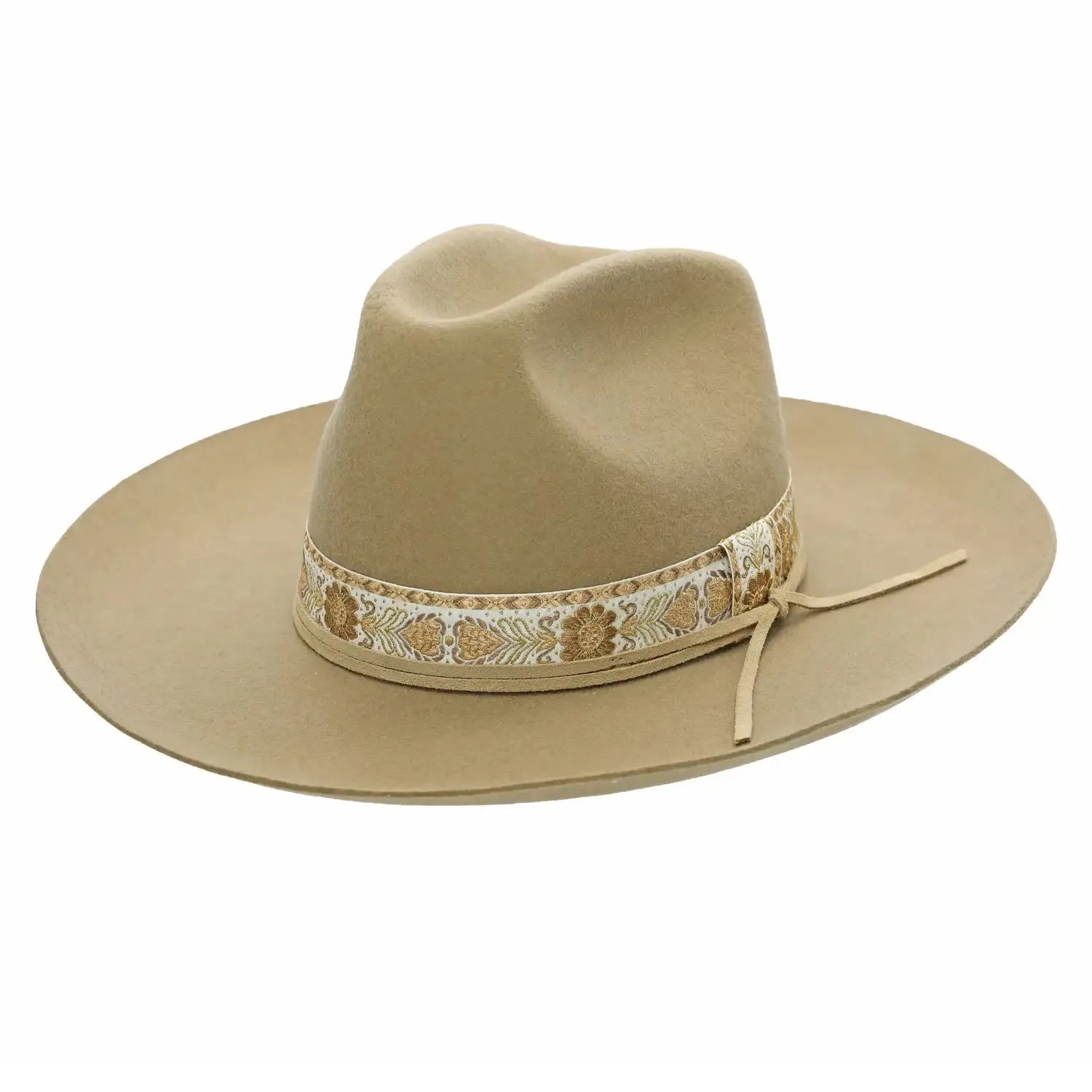 The hat features a white ribbon band adorned with a copper and tan floral pattern, beautifully accented by a double layer felt cord hatband over it. The wide brim not only provides a sophisticated silhouette but also enhances your stylish fall look. Embrace the season’s charm and make a statement with the Peter Grimm Itali Cowgirl Hat, the ultimate accessory for any autumn adventure.