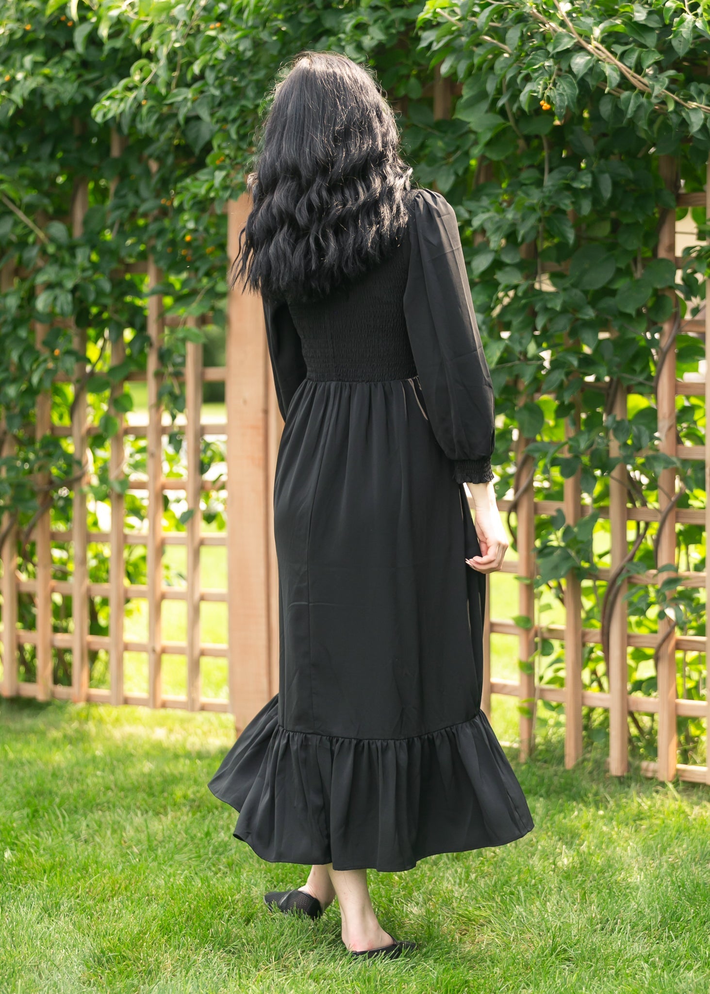 The Renee Smocked Bodice Long Sleeve Maxi Dress is a cute, basic, dress with subtle details for elevated style. This maxi dress is a solid black dress with a tiered hem. It features a fit and flair silhouette with a stretchy smocked bodice and lined flowy maxi length skirt. The long sleeves are loose for added comfort, with cinched cuffs to hold them in place!