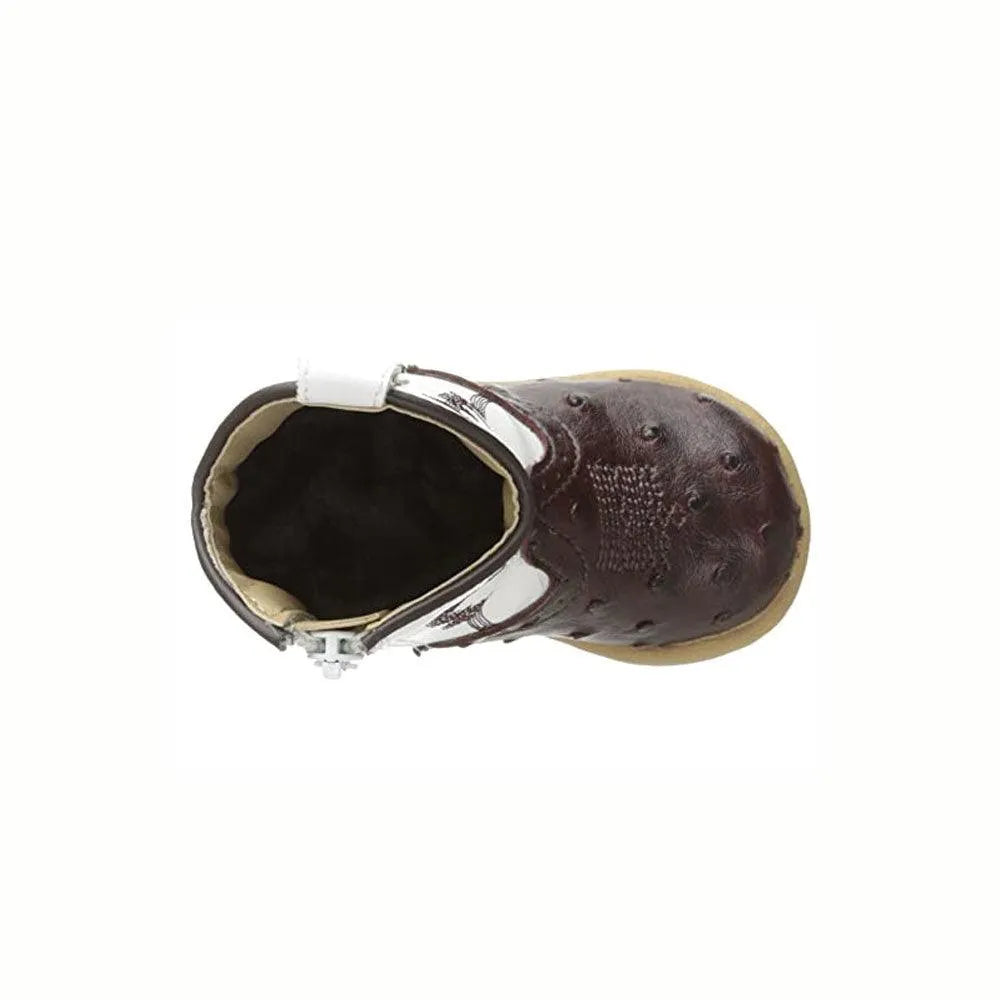 Just like Dad's. these good looking cowboy booties from Roper are crafted from quality faux leather with a brown ostrich print vamp and a 4" white shaft that has brown western stitching accents. The shaft has a side zipper for easy on and off. The sole is a flexible TPR sole and the insole is padded and cushioned. There's also a fabric lining on the inside.