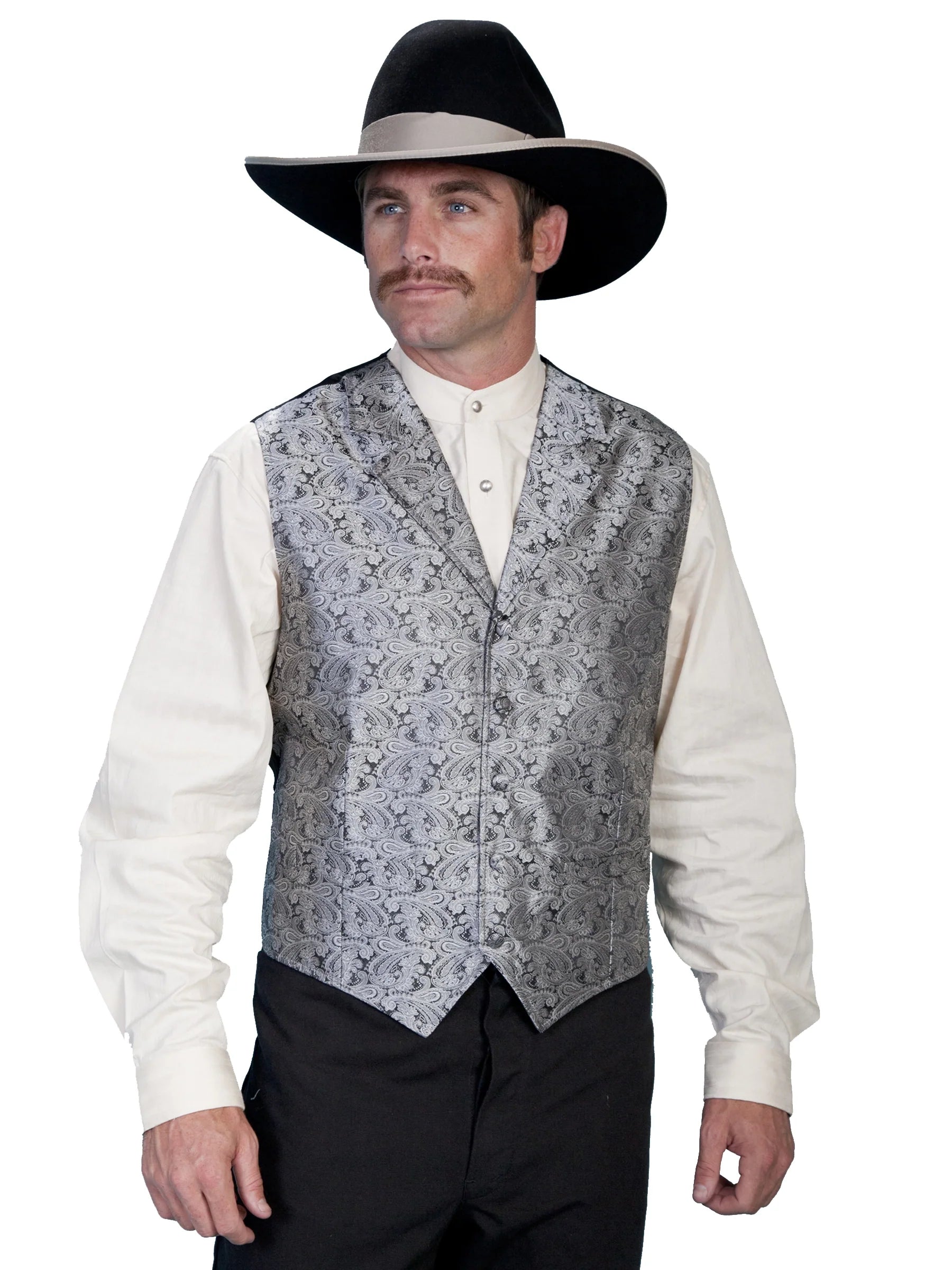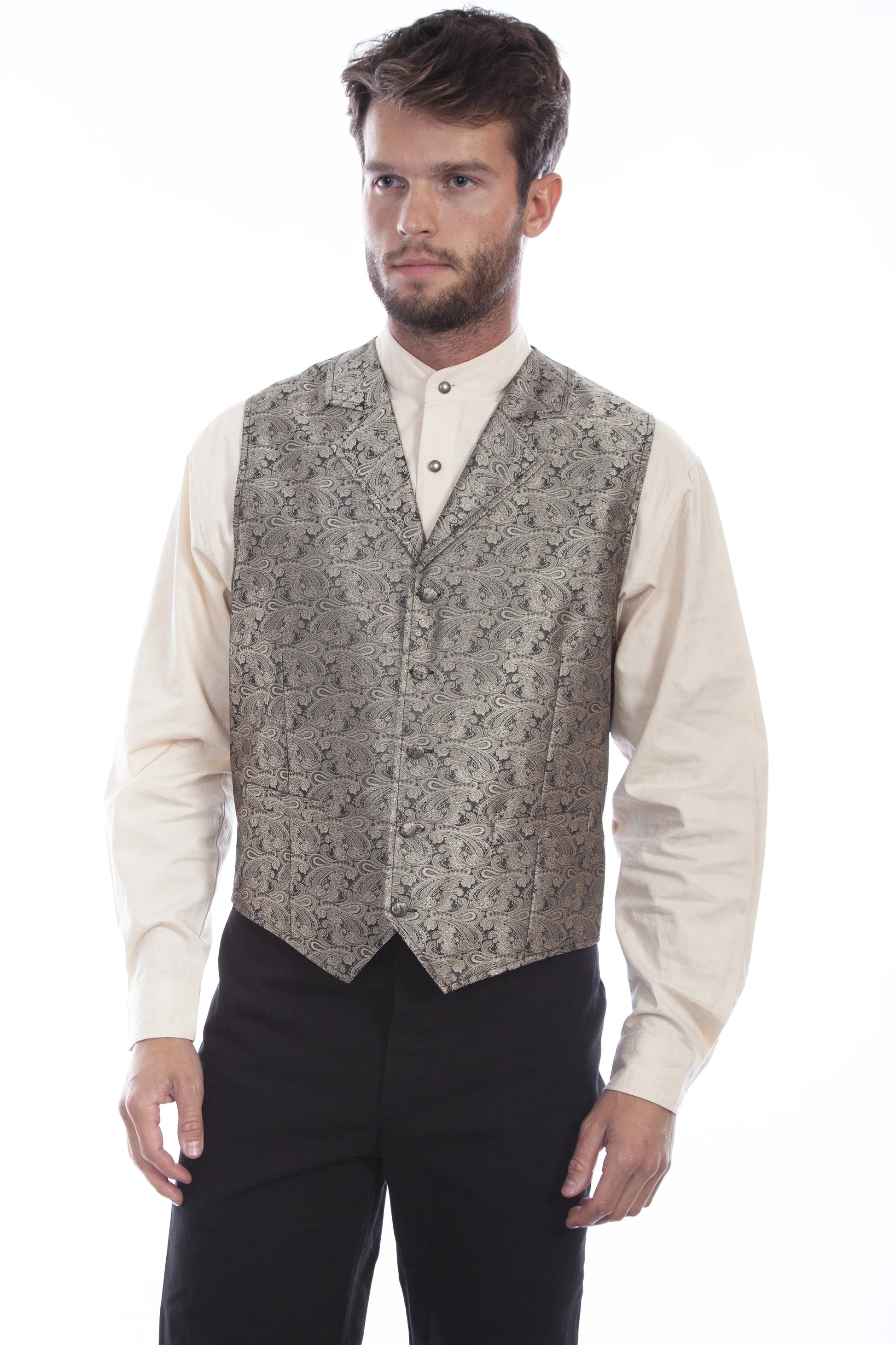 Elevate your formal wardrobe with this classic paisley vest. Featuring elegant notched lapels and a covered button front, it exudes timeless sophistication. Two welt pockets provide practical storage for a watch and chain, while the adjustable back strap ensures a perfect, tailored fit.