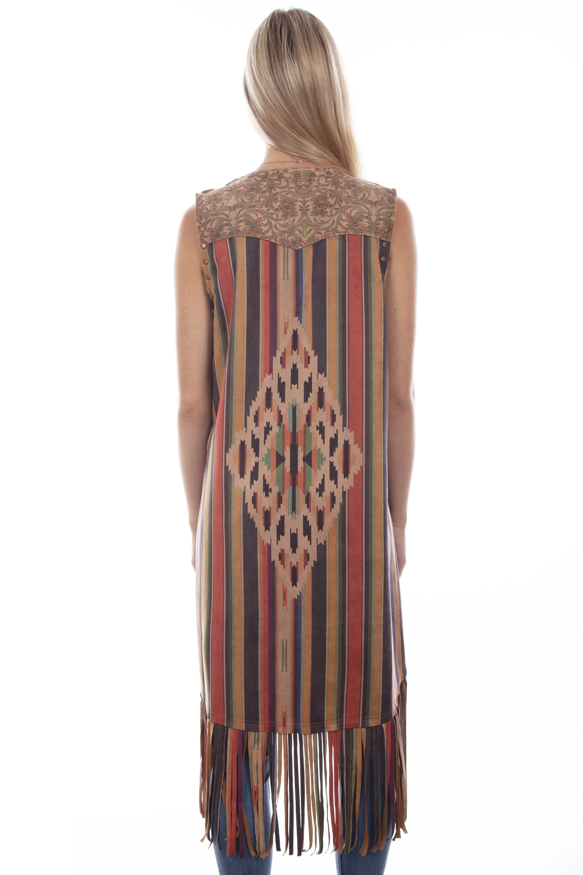 Capture the spirit of the Southwest with this microfiber long vest featuring a vibrant serape print and Aztec-inspired pattern on both the front and back. Designed as a long vest or duster, it showcases front and back yokes and is accented with copper studs on the upper sides and around the armholes for added detail.