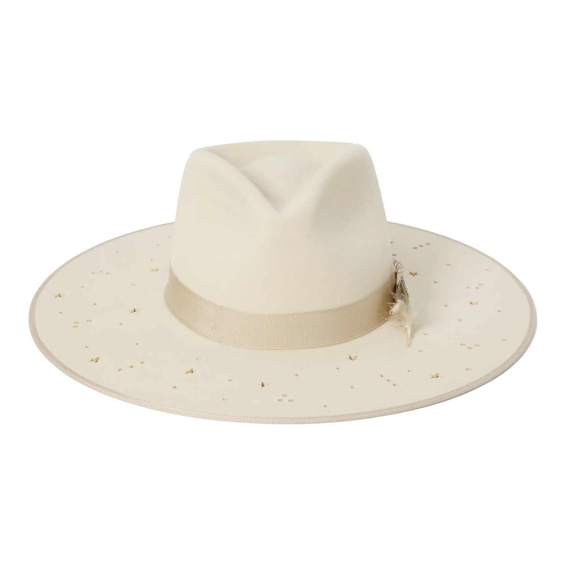 Embrace your inner cowgirl with the Fedora Style Western Hat, boasting a playful 4 1/2" brim adorned with random star cutouts. As you traverse the frontier, these celestial perforations cast a subtle constellation of light, turning heads and igniting conversations wherever you roam. The grosgrain ribbon-bound edge adds a touch of sophistication, framing the cosmos-inspired brim like a heavenly masterpiece.