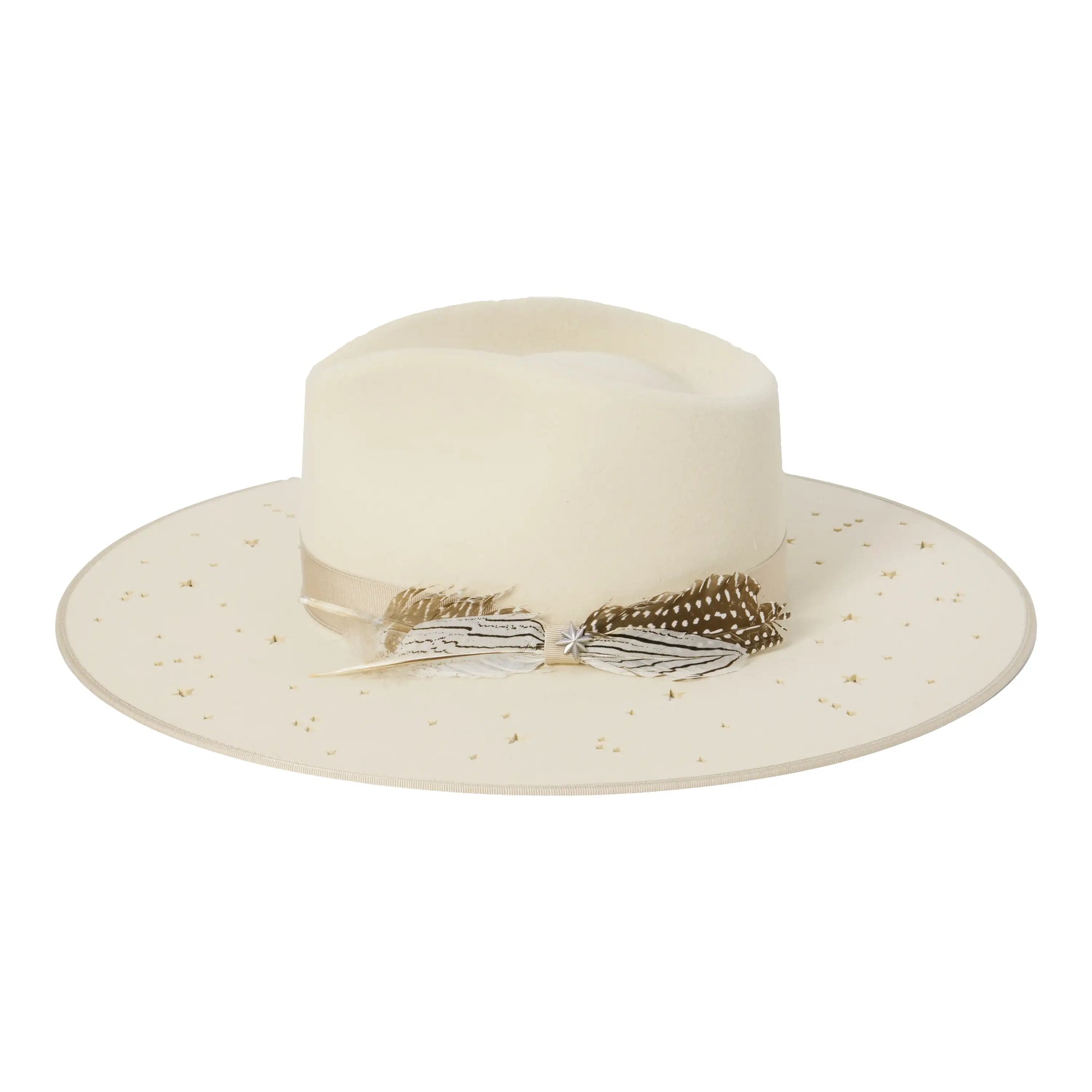As a beacon in the night, this hat from Stetson's Seeker Collection draws inspiration from the heavenly bodies above, making it an essential piece for the fall season. Immerse yourself in the starry-eyed allure of the Night Sky S Wide Brim Wool Felt Fedora Hat, meticulously crafted in the USA from 100% wool felt. The innovative design features star cutouts along the brim, a grosgrain ribbon hat band, and a grosgrain ribbon binding that adds a touch of celestial elegance.